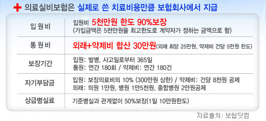 병원비용에 대해 5천만원 한도내에서 90%까지 보장을 받을 수 있으며