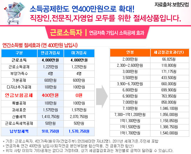 연금저축상품에 대해서 연간 400만원 한도로 소득공제혜택을 준다고하네요
